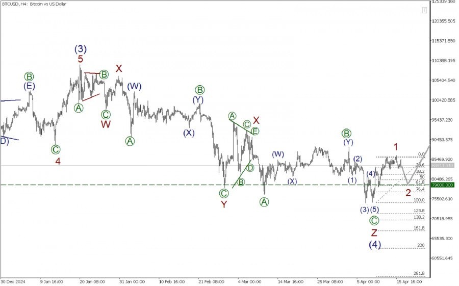 https://basechop.ru/wordpress/?p=38844 По криптовалютной паре BTC/USD с точки зрения волнового анализа в долгосрочной перспективе формируется крупный бычий импульс, который состоит из подволн (1)-(2)-(3)-(4)-(5). На текущем графике мы видим развитие второй его половины. Была завершены импульсная волна (3), после чего началось формирование сложной коррекции (4). Коррекционная волна (4) может принять форму тройного зигзага W-X-Y-X-Z. На сегодняшний день завершены подволны W-X-Y-X. Таким образом, на последнем участке графика может формироваться финальная действующая волна Z. Итак действующая волна Z, вероятнее всего завершилась в форме стандартного зигзага [A]-[B]-[C]. Импульс [A] и коррекция [B] уже завершены. Затем цена двигалась вниз в медвежьей импульсной волне [C]. На последнем участке цены мы можем наблаюдть развитие начальной части нового бычьего тренда. Скорее всего, уе завершена первая часть – тое сть имеется ввиду – подволна 1. В ближашее время ожидается падение в коррекции 2