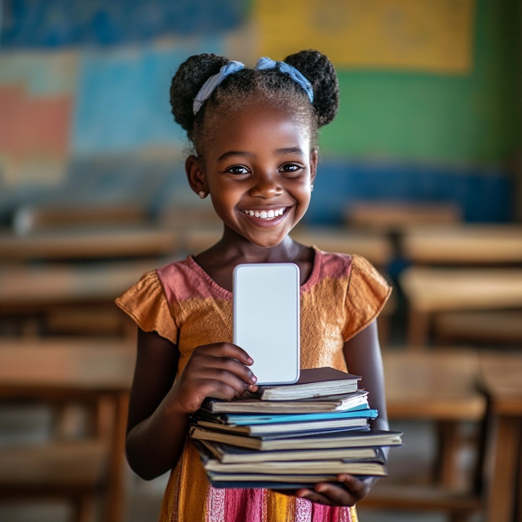 Создано на основе запроса: an african female child student carrying a stack of books while showing her white phone screen smiling standing
