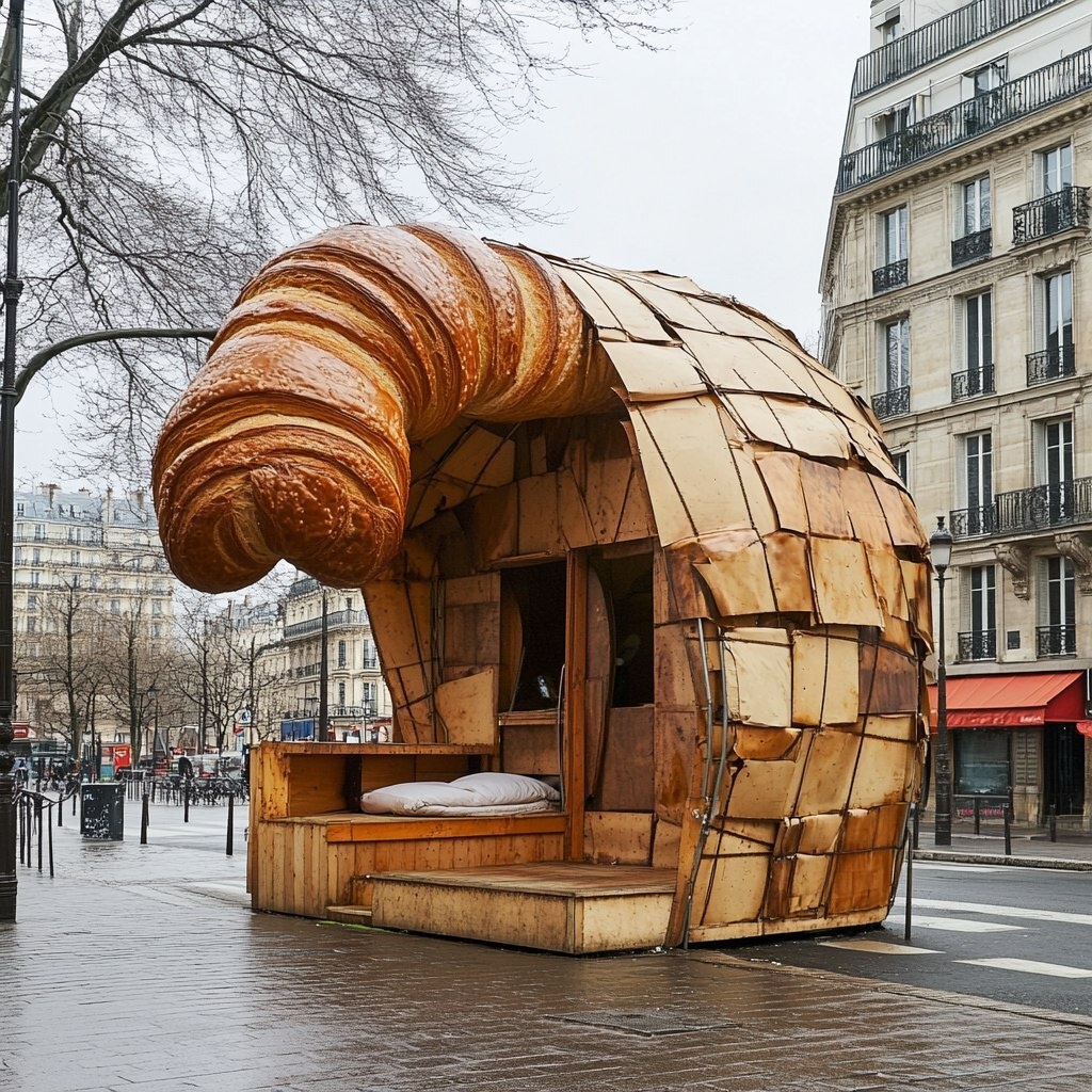 Создано на основе запроса: A temporary shelter in Paris, built with baguettes as the structure, huge croissant as a roof