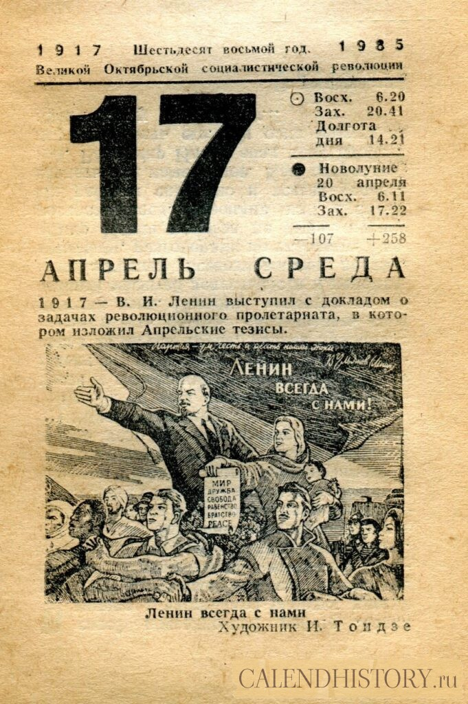 Итак, сегодня 17-го апреля и у нас на календаре 1985-й год. Перед нами листок советского календаря для женщин. На календаре у нас среда - 17 апреля 1985-го года. 1917 — В. И. Ленин выступил с докладом о задачах революционного пролетариата, в котором изложил Апрельские тезисы. Ленин всегда с нами