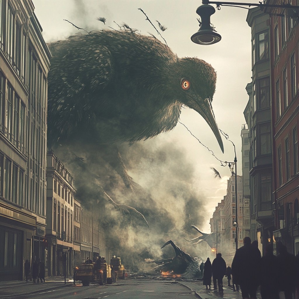 Создано на основе запроса: giant kiwi bird destroys malmö city in godzilla style steampunk