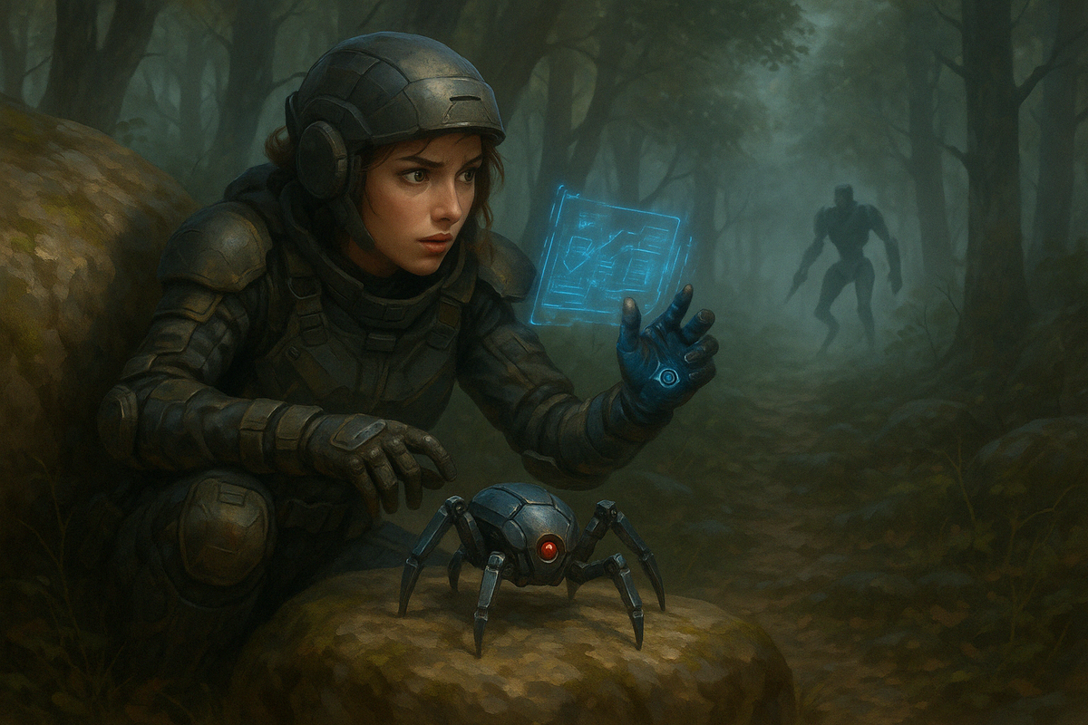 Она открыла один из многочисленных карманов на боевом комбинезоне и достала маленький металлический икосаэдр. Сжала его в кулаке и бросила на землю. Ещё в полёте двадцатигранник начал развёртываться, и на землю уже опустился механический паучок с камерами и устройством подавления сигнала. Девушка подняла левую руку с браслетом на запястье и нажала на нём кнопку. Над рукой возникла голографическая трансляция с камер паучка. Правая перчатка уже светилась маленькими диодами. Движение руки — и устройство на земле направилось из-за укрытия в сторону противника.
