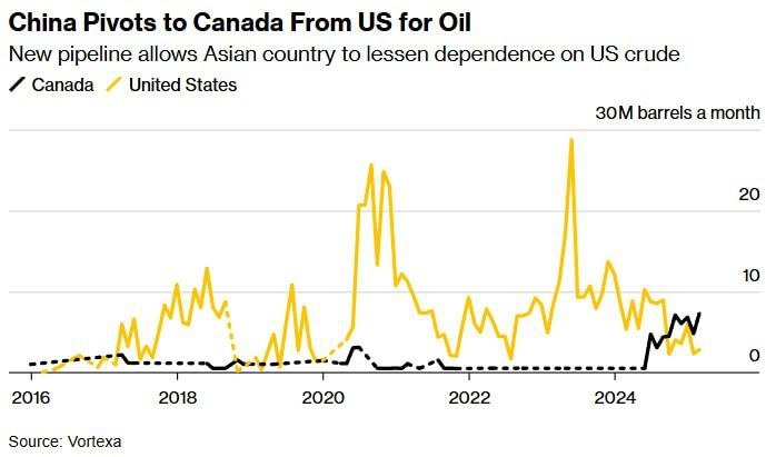 China turns to CANADA for oil after snubbing American black gold, slashing purchases of US oil by 90% Pipeline expansion in Western Canada opened less than a year ago & presents China with expanded access to vast crude reserves