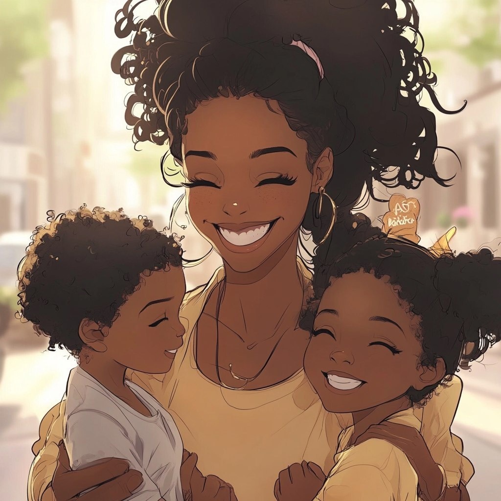 Создано на основе запроса: black mom having fun with her 2 kids, anime style