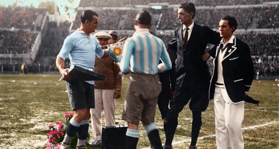Самый первый в истории Чемпионат мира по футболу прошел в далеком 1930 году в Уругвае. Так уж случилось, что из-за длительного и дорогостоящего переезда из Европы в Южную Америку в турнире смогли принять участие только 4 европейские сборные. Еще 7 было из Южной Америки и 2 - из Северной. Чемпионат мира в те времена не шел ни в какое сравнение с нынешним турниром. Самые первые матчи не вызывали особого ажиотажа среди зрителей, собирая на трибунах порой по 700 - 800 человек. К тому же и главный стадион турнира - «Сентенарио» был введен в эксплуатацию уже с началом турнира. Ожидаемо, что в финал в итоге вышли две именно латиноамериканские сборные, потому как их банально было больше. Но уже перед самим финалом произошел очень курьезный момент - заявленный судья отказался обслуживать главную встречу турнира, а нового арбитра все никак не могли найти. Из-за чего такое вдруг могло произойти? Финал Чемпионата мира 1930 (источник - fifa.com) В финале на стадионе «Сентенарио» должны были встреча