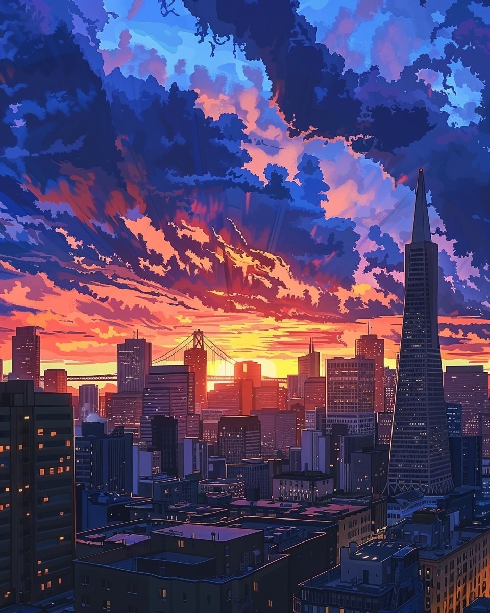 Создано на основе запроса: comic painting of a wonderful and incredible and breathtaking San Francisco skyline landscape with a sunset, in a