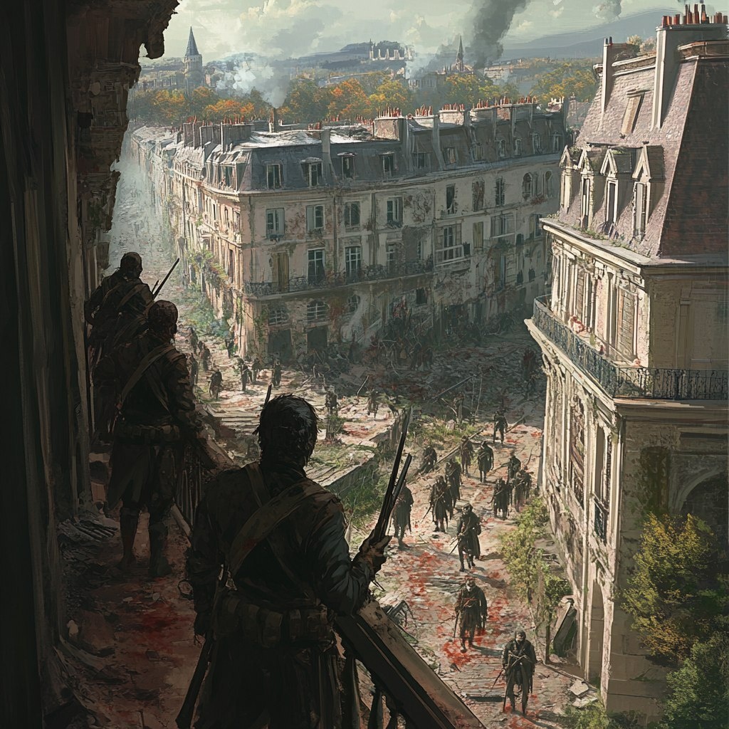 Создано на основе запроса: in a ruined french city, napoleonic zombie soldiers move through the streets, seen from a balcony, artwork