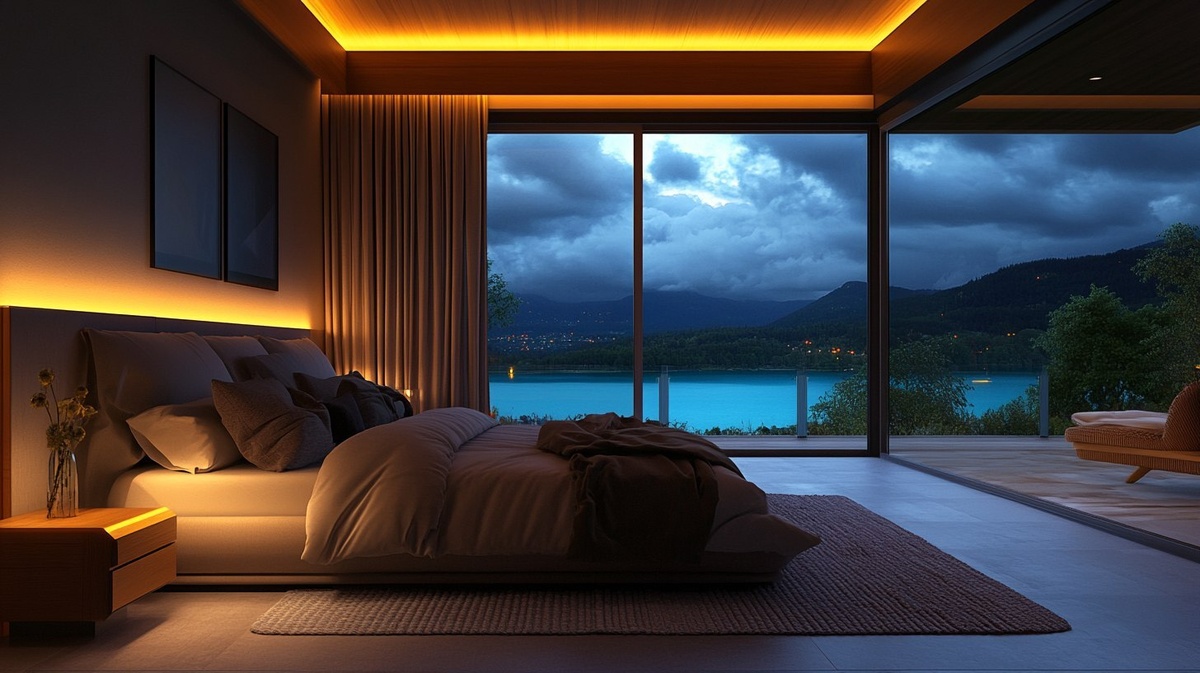 Создано на основе запроса: 3D rendering of a cozy bedroom, large open bifold patio door, outside is a turquoise lake, cloudy and dark, warm