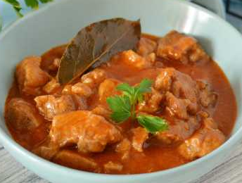 Ингредиенты: - 120 г говядины (лопаточная и подлопаточная части, грудинка, покромка) или 110 г свинины (лопаточная и шейная части), или 110 г баранины, козлятины (лопаточная часть) - 10 г жира животного топленого пищевого - 20 г лука репчатого - 15 г томатного пюре - 5 г муки пшеничной - 100 г соуса Гарнир: - 50 г картофеля жареного во фритюре - 100 г овощей отварных с жиром Выход готового блюда - 325 г Приготовление: Мясо нарезать небольшими кусочками весом примерно 20–30 граммов, слегка обжарить, потом залить бульоном либо водой и тушить вместе с пассерованным томатным пюре под крышкой примерно один час. Оставшийся от тушения бульон использовать для приготовления соуса — туда добавить жареный лук, посолить, поперчить, этой смесью полить мясо и продолжать тушение ещё 25–30 минут. Лавровый лист лучше всего добавлять за 5–10 минут до конца готовки. По желанию в блюдо из говядины добавляют немного чеснока (примерно 0,8 грамма на одну порцию), также возможно дополнить рецепт сметаной (око