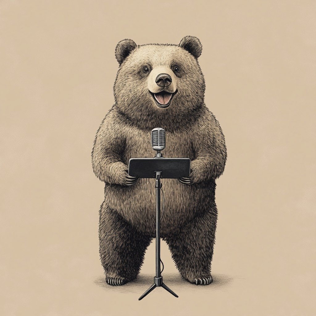 Создано на основе запроса: a bear presenting with no microphone, beige background minimalist