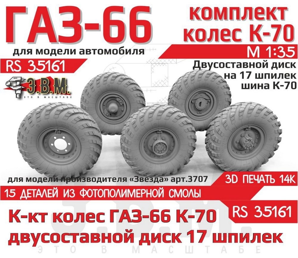 Э.В.М. из Севастополя выпустила на 3D-принтере третий набор колес для модели ГАЗ-66 в масштабе 1/35 от "Звезды" и набор опорных катков (12 шт.) для САУ Ferdinand / Elefant и Tiger I (P) Porsche в том же масштабе: Колеса для ГАЗ-66 с шиной К-70 на двусоставном диске (17 шпилек) - каталожный номер RS35161 Опорные катки для САУ Ferdinand / Elefant / Tiger I (P) Porsche (RS35165)