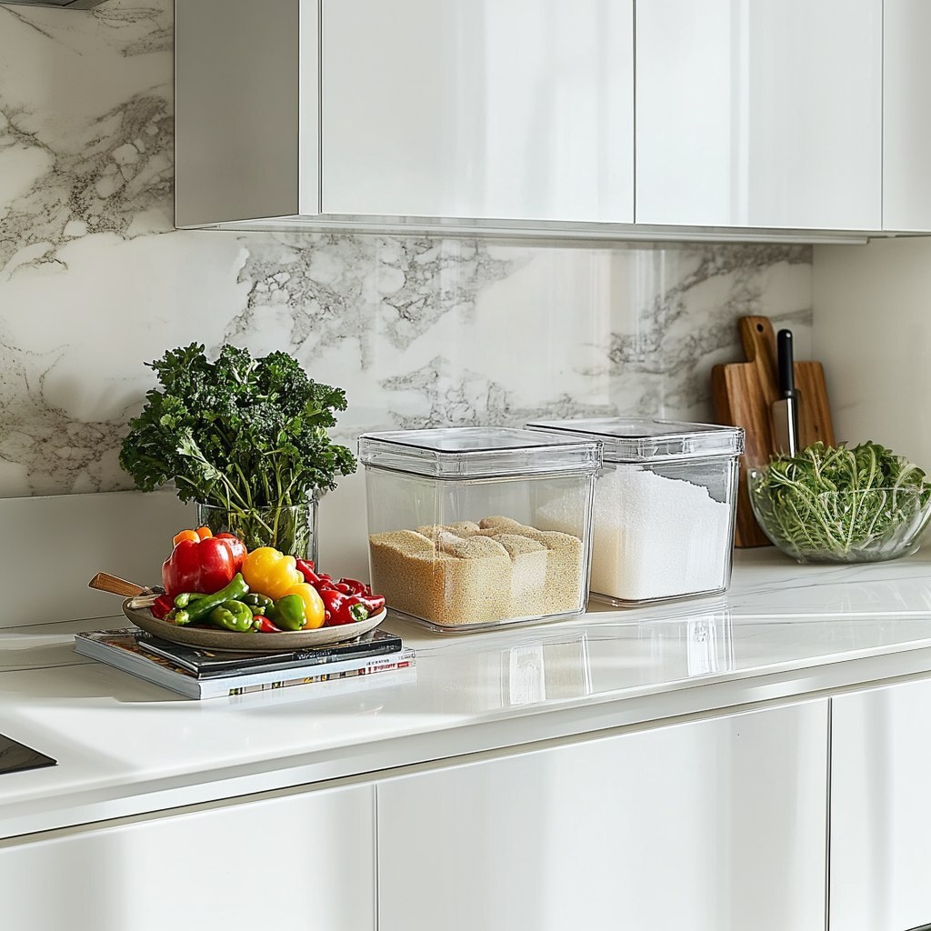 Создано на основе запроса: Real shot, on a white kitchen countertop, there are two square plastic storage jars, one filled with white sugar