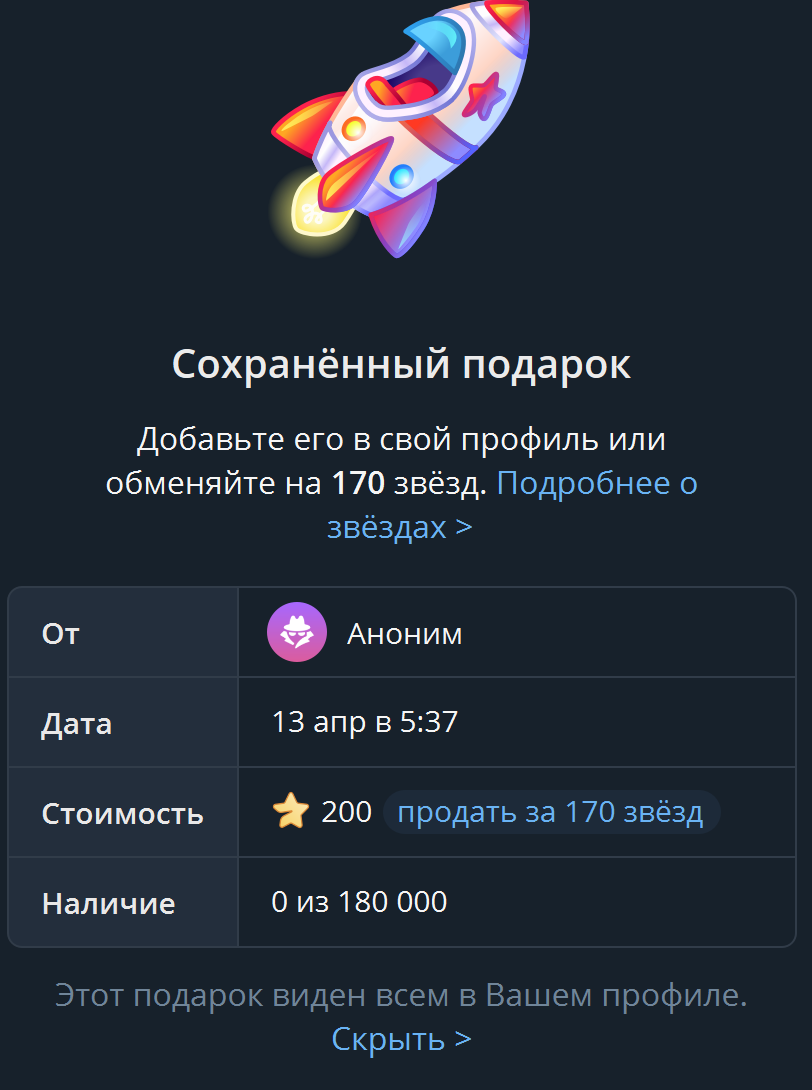 Теперь ты знаешь, как скрыть подарки в тг. Полностью убрать их из профиля пока нельзя, но можно не добавлять их на страницу, скрыть имя отправителя или продать через проверенный бот Тоннель.