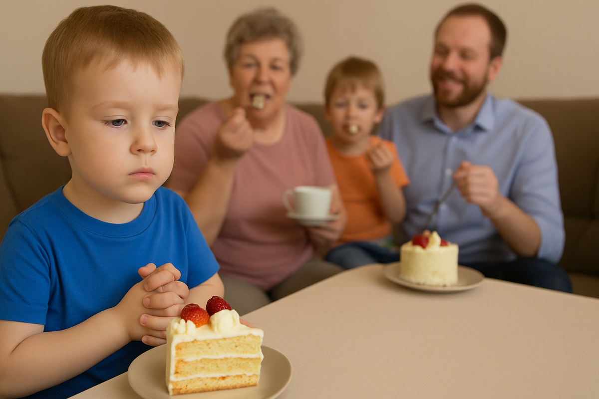 Когда все начали резать торт и весело причмокивать, мой малыш просто сидел в углу дивана и смотрел. Он не капризничал. Не плакал. Просто глотал слюнки. В его взгляде было столько взрослого понимания, что мне стало больно.