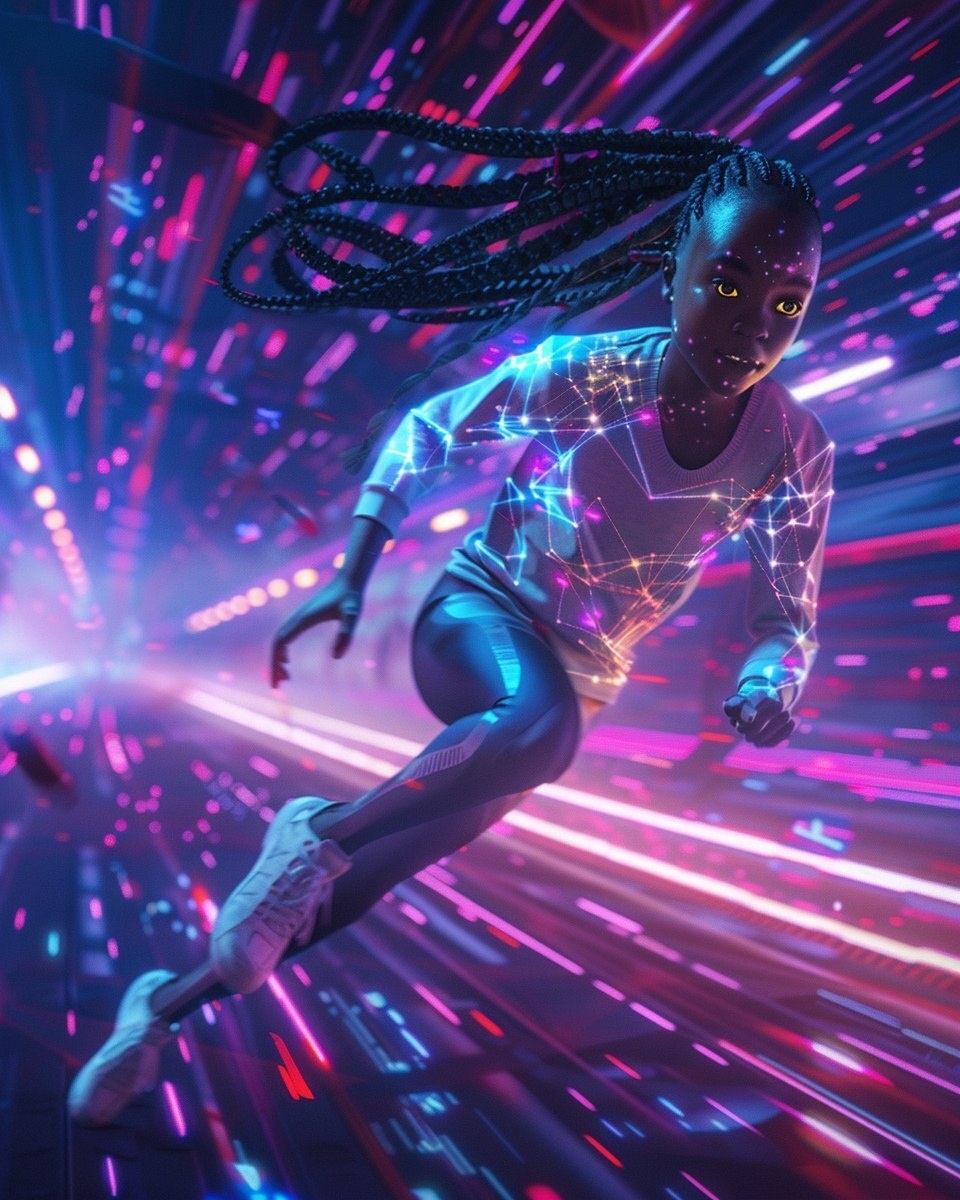 Создано на основе запроса: young African-American girl running into a futuristic horizon, glowing digital codes flowing across the sky like