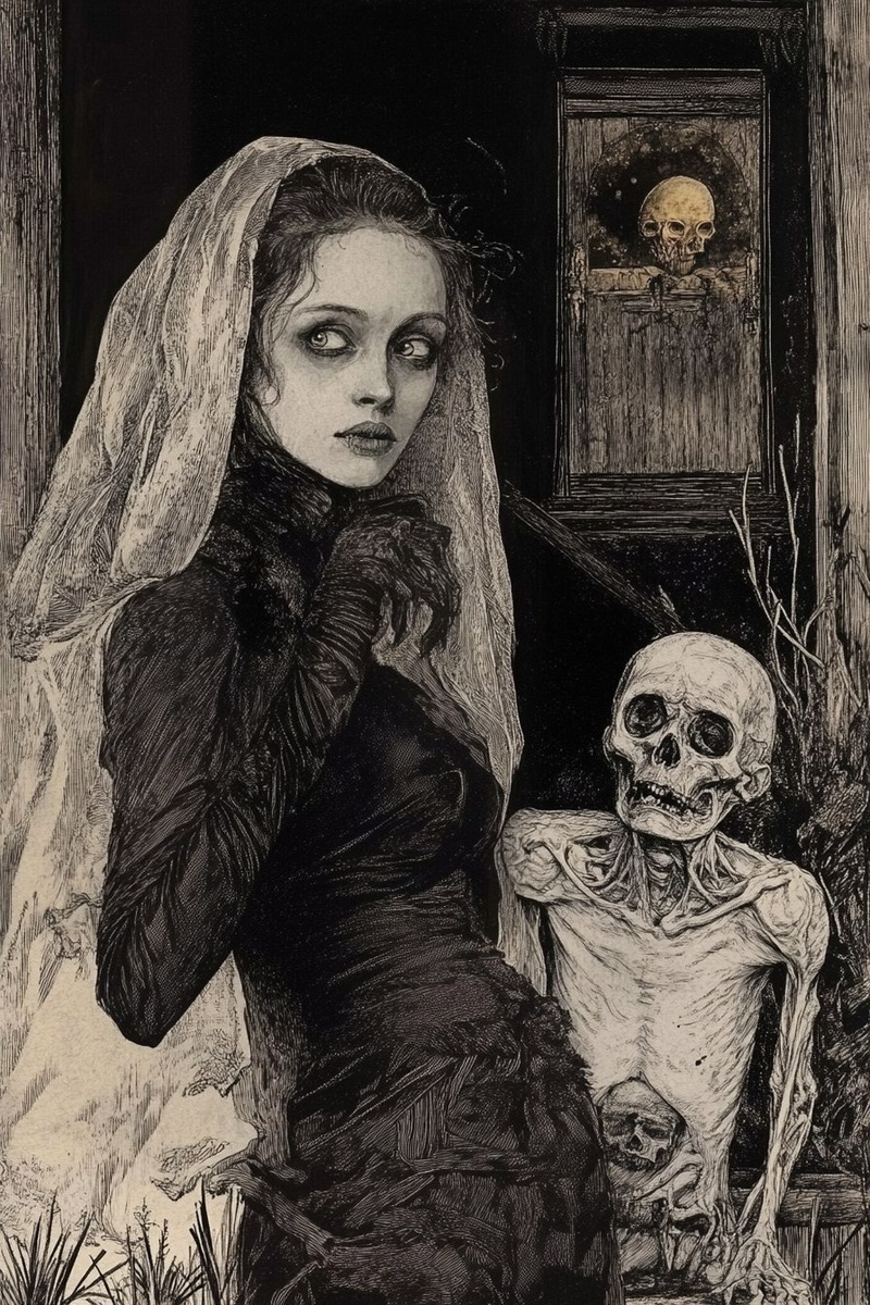 Создано на основе запроса: possum, gothic, old house, young woman with funeral veil, sickly young man extremely emaciated, pulp art