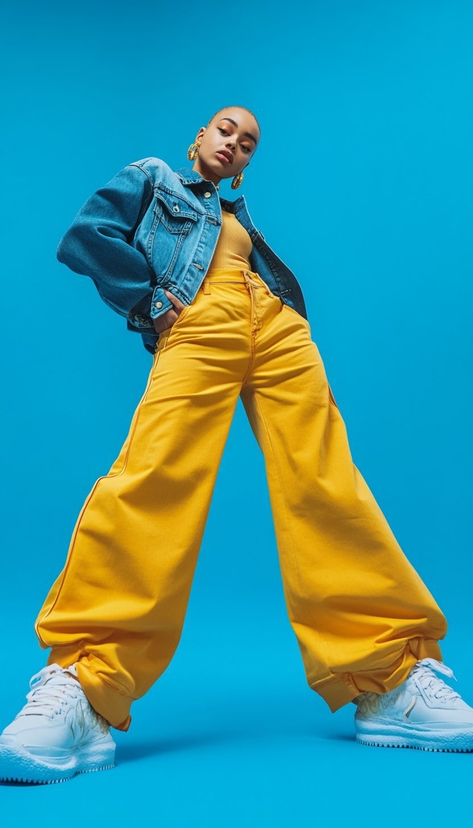 Создано на основе запроса: Vogue photoshoot of singer Jorja wearing a denim jacket and yellow wide-leg pants, posing on a blue background with large sneakers. --- Автоперевод: Фотосессия Vogue певца Джорджи в джинсовой куртке и желтых штанах с широкими ногами, позируя на синем фоне с большими кроссовками. Неплохо выглядит? 🤔 https://dzen.ru/id/65c0c65c86e4f837c27b24d7 #ИИ #AI #нейросеть #midjourney #art