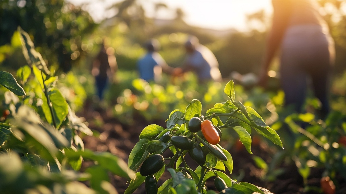 Создано на основе запроса: Bathed in the soft light of early morning, a vibrant farm comes to life with rows of thriving avocado trees, fiery red chilli plants, and lush ginger leaves pushing through rich soil. In the foreground, a group of Black farmers --- Автоперевод: Залитая в мягком свете раннего утра, оживленная ферма оживает с рядами процветающих деревьев авокадо, огненных красных растений чили и пышными имбирными листьями, проталкивающими богатую почву. Круто выглядит? 🤔 https://dzen.ru/id/65c0c65c86e4f837c27b24d7 #ИИ #AI #нейросеть #midjourney #art