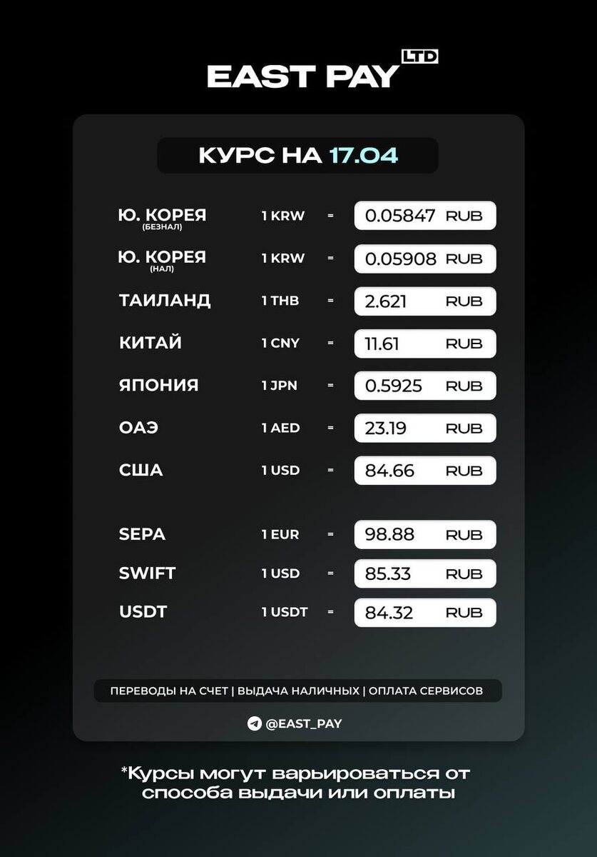 💙SWIFT / SEPA переводы 💙Пополнение зарубежных счетов 💙Выдача наличных за границей 💙Криптовалюты 🔘В течение дня курс может меняться. Рекомендуем уточнять актуальный курс у менеджера. ❗️У нас открылся новый офис в Москве по адресу: Пресненская набережная, 12, Башня Федерации (восточный вход) 🔴🔴🔴🔴🔴🔴🔴🔴🔴🔴 🟠Написать менеджеру: @east_pay_world 🟠Сделать просчет самостоятельно в боте: @East_PaySer_bot ✈️ Подписаться на «East Pay»