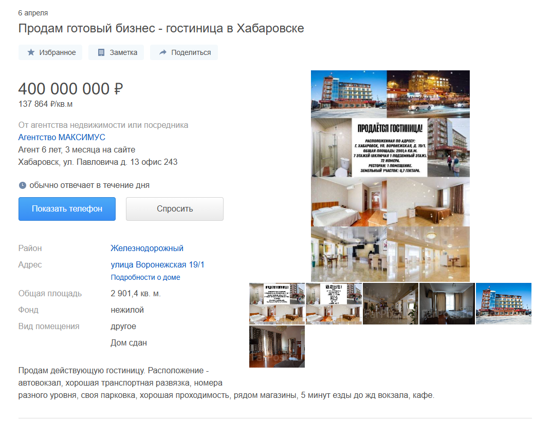 Объявления о продаже недвижимости появились на сайте Farpost. Речь идет о гостиницах, которые находятся в Хабаровске, Ванинском и Николаевском районах. Все они относятся к крупной гостиничной сети «Пять звезд», владельцем которой является предприниматель Юрий Васильев. Самая дорогая гостиница расположена возле хабаровского автовокзала. Общая площадь 2 901,4 кв. м. Стоимость - 400 000 000 рублей. - Продам действующую гостиницу. Расположение — автовокзал, хорошая транспортная развязка, номера разного уровня, своя парковка, хорошая проходимость, рядом магазины, 5 минут езды до ж/д вокзала, кафе, - говорится в объявлении. Выставлена на продажу и гостиница в Ванино по адресу: улица Портовая, 1а. Она стоит 150 миллионов. - Общая площадь 2303,3 кв.м, 56 номеров. На первом этаже кафе на 40 мест, - указано в объявлении. Самый дешевый и компактный отель располагается в селе Подгорном Николаевского района. Его стоимость составляет 12 500 000 рублей. С чем связана продажа гостиниц, не уточняется.