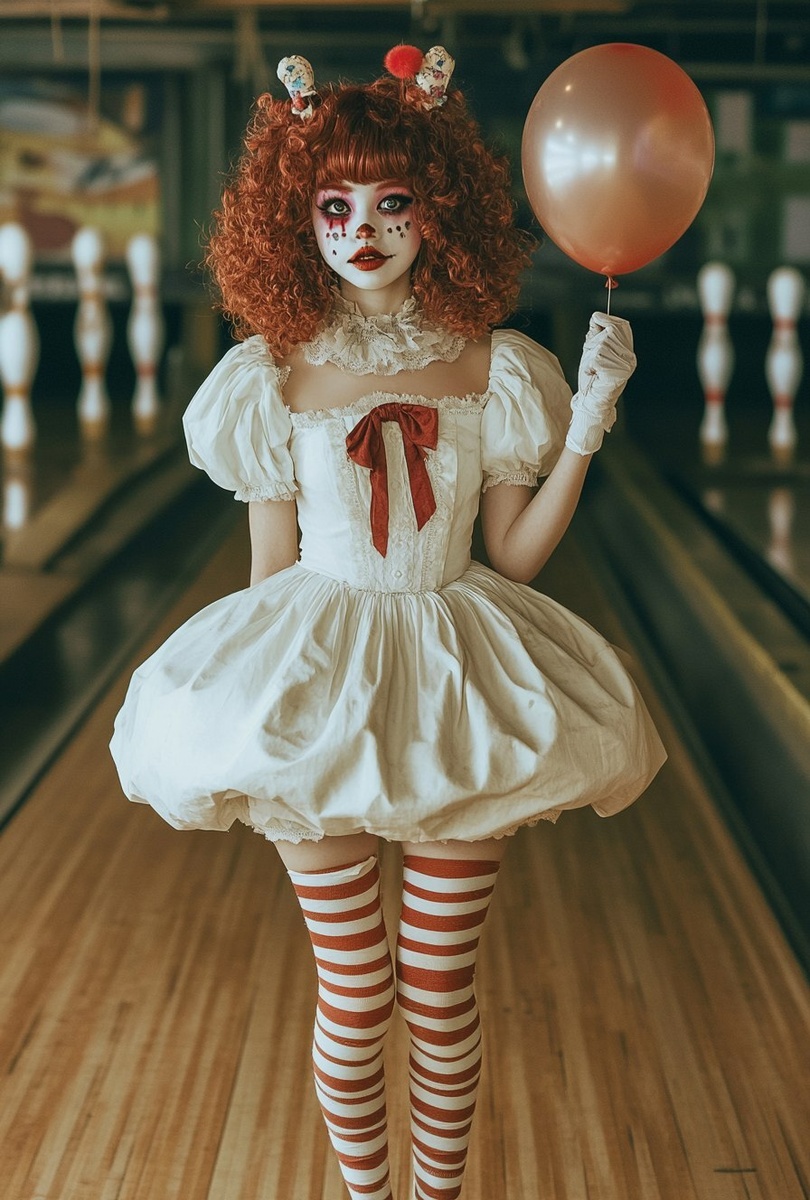 Создано на основе запроса: A full-body photo of an extremely short Japanese woman with curly red hair and freckles, wearing a white puffy vintage circus dress, striped socks, and clown makeup on her face. She is holding a small balloon in her hand, with bowling pins in the background. --- Автоперевод: Фотография всего тела очень короткой японской женщины с вьющимися рыжими волосами и веснушками, одетая в белое пухлое винтажное цирковое платье, полосатые носки и макияж клоуна на ее лице. Круто выглядит? 🤔 https://dzen.ru/id/65c0c65c86e4f837c27b24d7 #ИИ #AI #нейросеть #midjourney #art