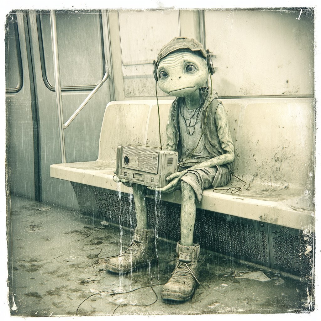Создано на основе запроса: A candid ‘street photo’ of a humanoid Kappa Yokai seated in a dimly lit subway car, holding a retro cassette player, dripping water onto the floor. Rendered in gritty cartoon realism with muted color palette, mimicking a worn-out Polaroid snapshot with vignetting, artificial blur, and flash shadowing. Gritty documentary feel meets supernatural absurdity. --- Автоперевод: Откровенное «уличное фото» гуманоидного каппа -Йокая, сидящего в тускло освещенной машине метро, держащего ретро -кассетный игрок, капающий водой на пол. Интересно выглядит? 🤔 https://dzen.ru/id/65c0c65c86e4f837c27b24d7 #ИИ #AI #нейросеть #midjourney #art