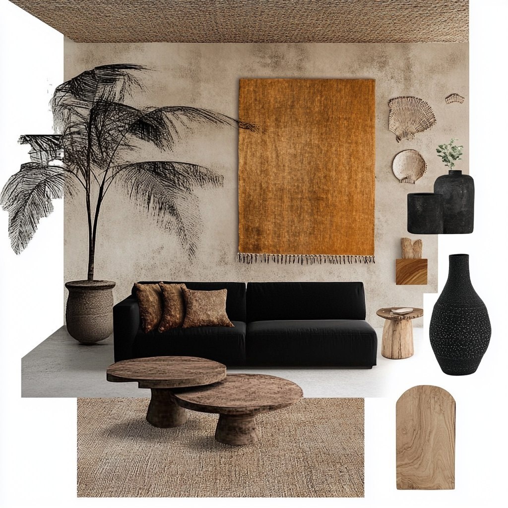 Создано на основе запроса: moodboard for bold modern bali villa lounge african inspred , ochre walls , black sofa , fabric wall handing