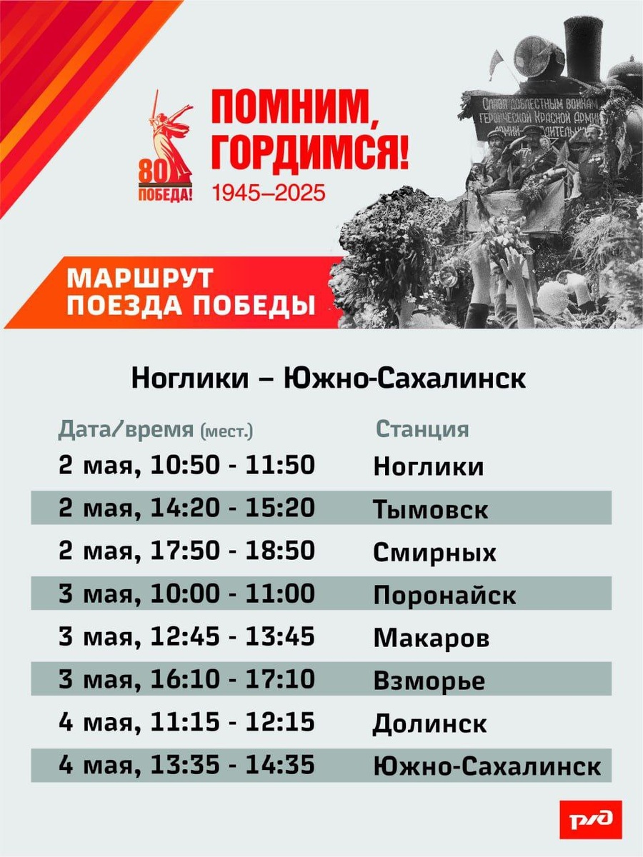 🚂 Ретро-поезд «Победа» завершит своё путешествие по острову в Южно-Сахалинске 📍С 2 по 4 мая ретро-поезд проедет от Ноглик до Южно-Сахалинска. Железнодорожники поздравят ветеранов и местных жителей с 80-летием Великой Победы и проведут концертные программы. В состав ретро-поезда войдут пассажирские вагоны для ветеранов и почётных гостей, а также экспозиции боевой техники тех лет: танки, грузовики и бронеавтомобили, а также гаубицы и полевые пушки. ⭐ Обязательно сохраняйте расписание! Почтим память Героев вместе! @ao_pk_sakhalin 💬 @ysakhalinsk