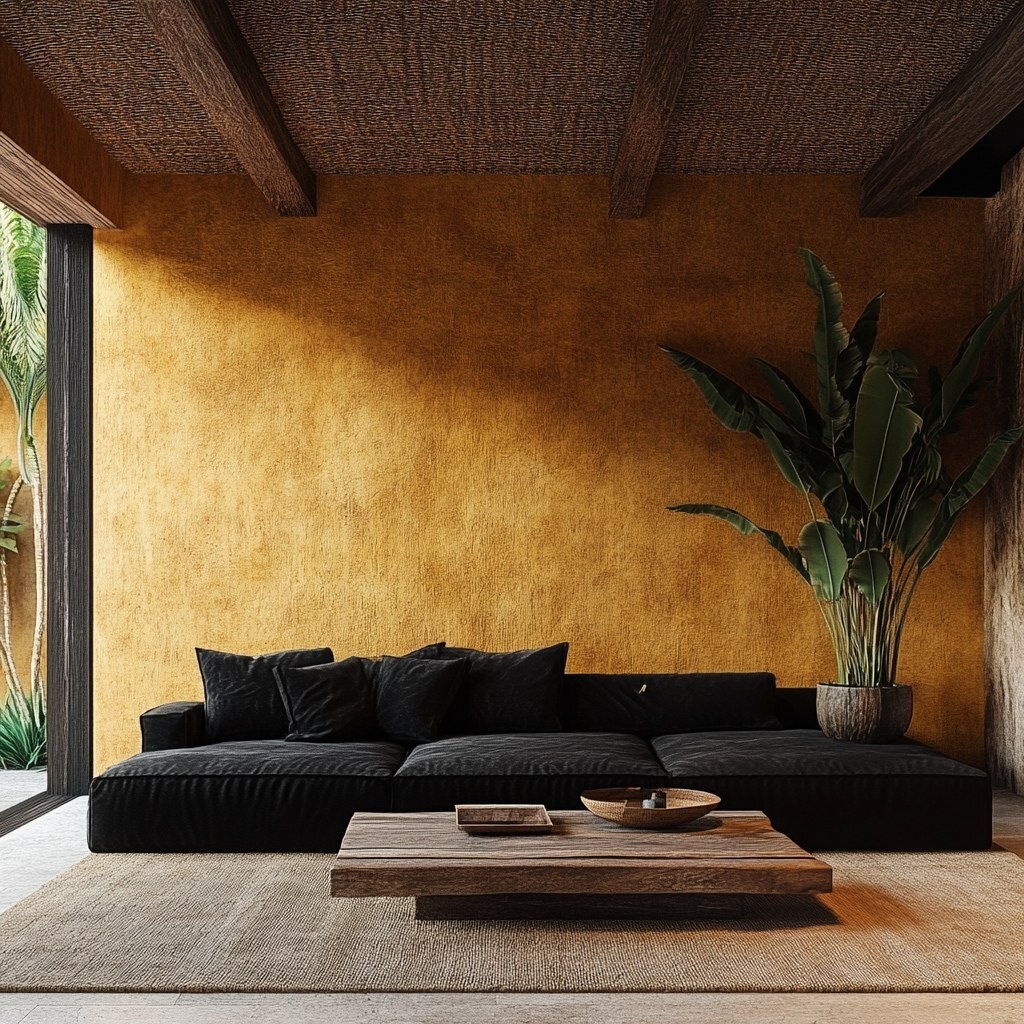 Создано на основе запроса: bokd modern bali villa lounge african inspred , ochre walls , black sofa , fabric wall handing large winddows