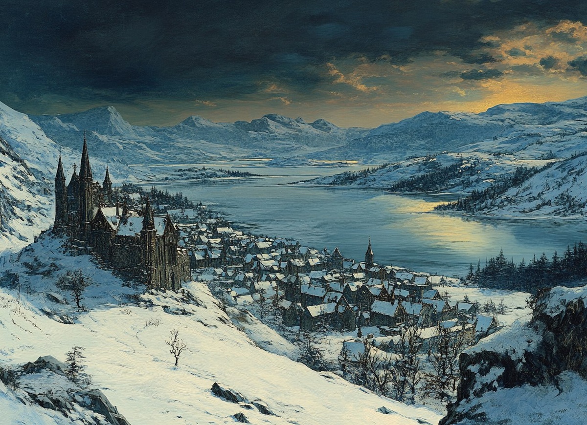Создано на основе запроса: Clyde Caldwell, fantasy lithograph, looking down on a large flat snowy village on an open lake, in a dark hilly tundra, gothic fantasy