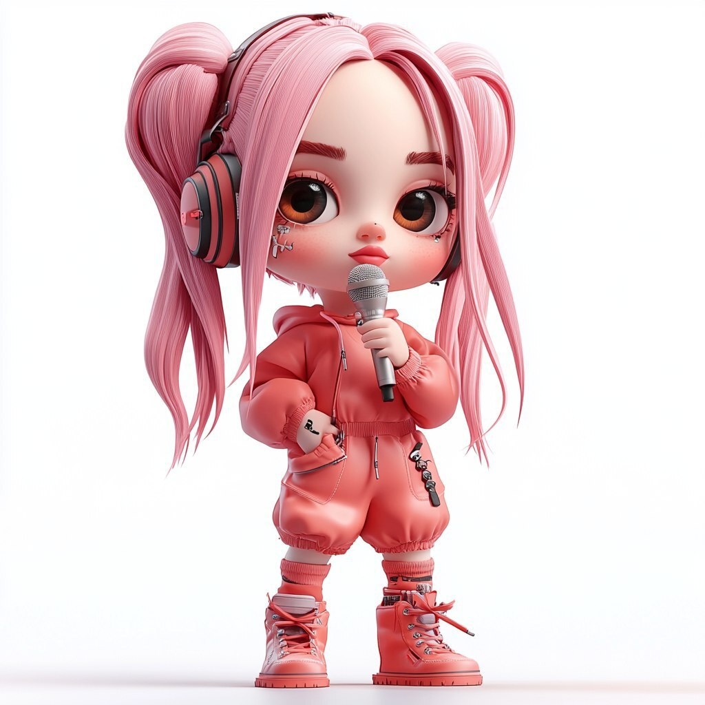 Создано на основе запроса: a cute singer that dresses like billie elilish holding a microphone, big head small body, hand drawn 3d render