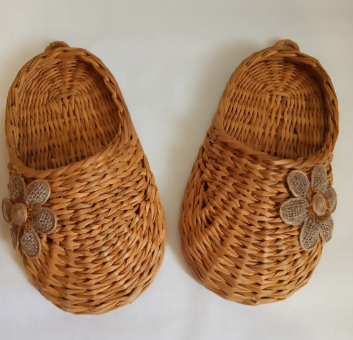 Итак, сплести из бумажной лозы можно как детские лапоточки: