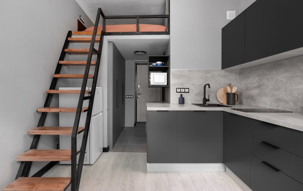 Кухонный гарнитур собран из готовых модулей, что позволило уложиться в бюджет и сроки. Под лестницей установлен холодильник высотой 119 см — меньше стандартного, но вместительнее мини-холодильников и оснащен морозильной камерой. Варочная панель электрическая, на две конфорки. Вытяжку и духовой шкаф не ставили, ориентируясь на молодую аудиторию, не увлеченную готовкой. Установка посудомойки также не предусмотрена из-за бюджета и целевой аудитории. Под навесными шкафами есть подсветка рабочей зоны.