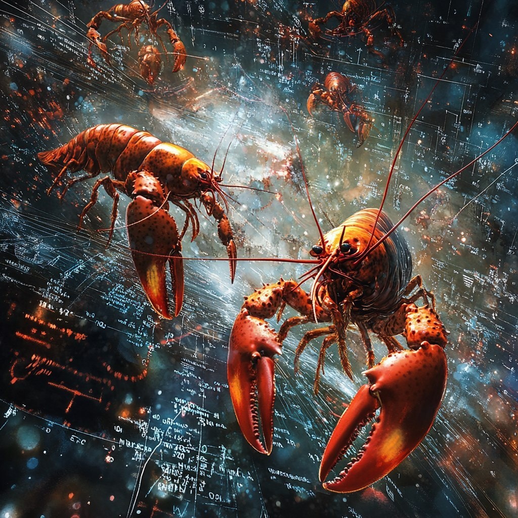 Создано на основе запроса: many cool Norway lobsters, lost amidst a sea of swirling mathematics and physics formulas, trying to decipher the