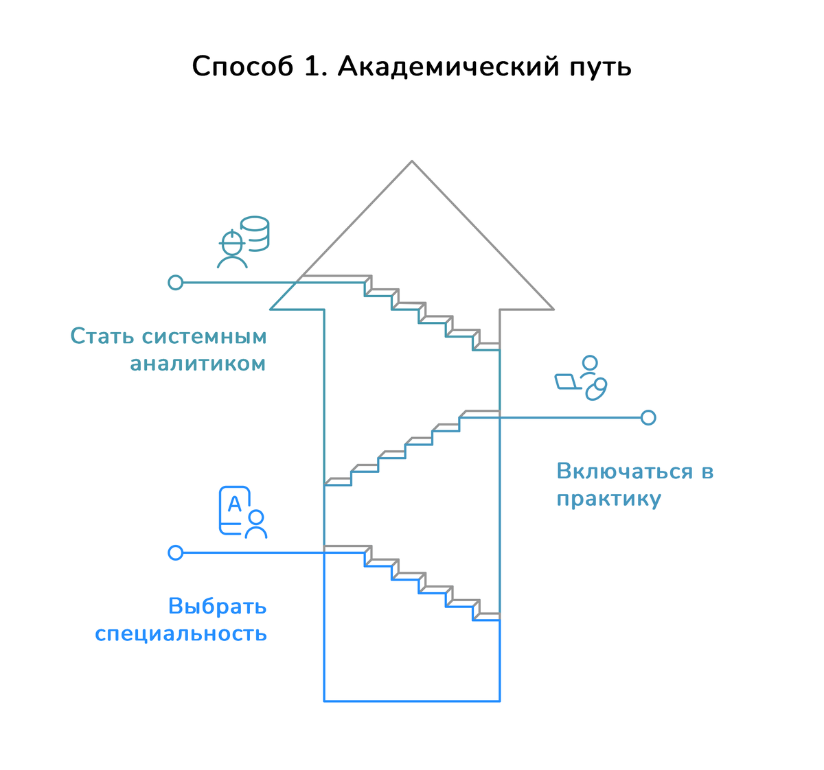 Суть: поступить в профильный вуз, получить высшее образование и параллельно начать работать в IT (на позициях стажёра в разработке, тестировании, техподдержке и т. д.). Затем перейти в роль младшего системного аналитика.
