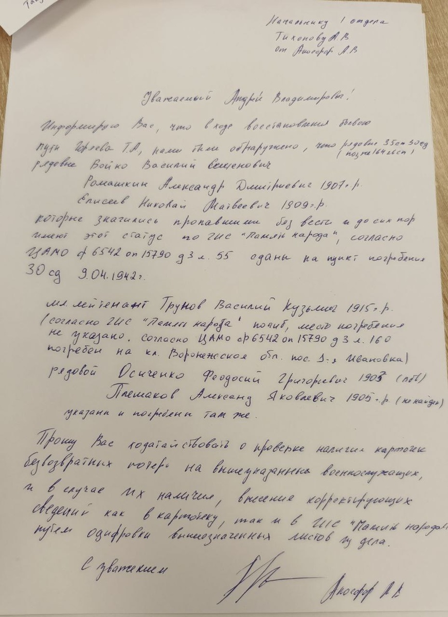 Одна из постоянных наших практик -внутренняя рабочая переписка с архивом по принципу "нашел? Скажи архиву где". В данном случае, в финансовых документах 35 сп нашлись сразу 4 солдата, у которых либо не указано место погребения, либо они имеют статус "пропал без вести", а в деле есть сведения о гибели и захоронении. Рядовые Бойко Василий Семенович; Ромашкин Александр Дмитриевич, 1907; Елисеев Николай Матвеевич, 1909; Осиченко Федосий Григорьевич, 1903; Плешаков Александр Яковлевич, 1905; Мл. лейтенант Трунов Василий Кузьмич, 1915; В рабочем порядке просим архив проверить данные на них в картотеке безвозвратных потерь и внести корректирующую информацию. Честно говоря, по-моему мы единственные кто так делает. Понимаю, что это добавляет хлопот сотрудникам, но если не уточнять картотеку, найти что-то будет сложно. #рабочиебудни