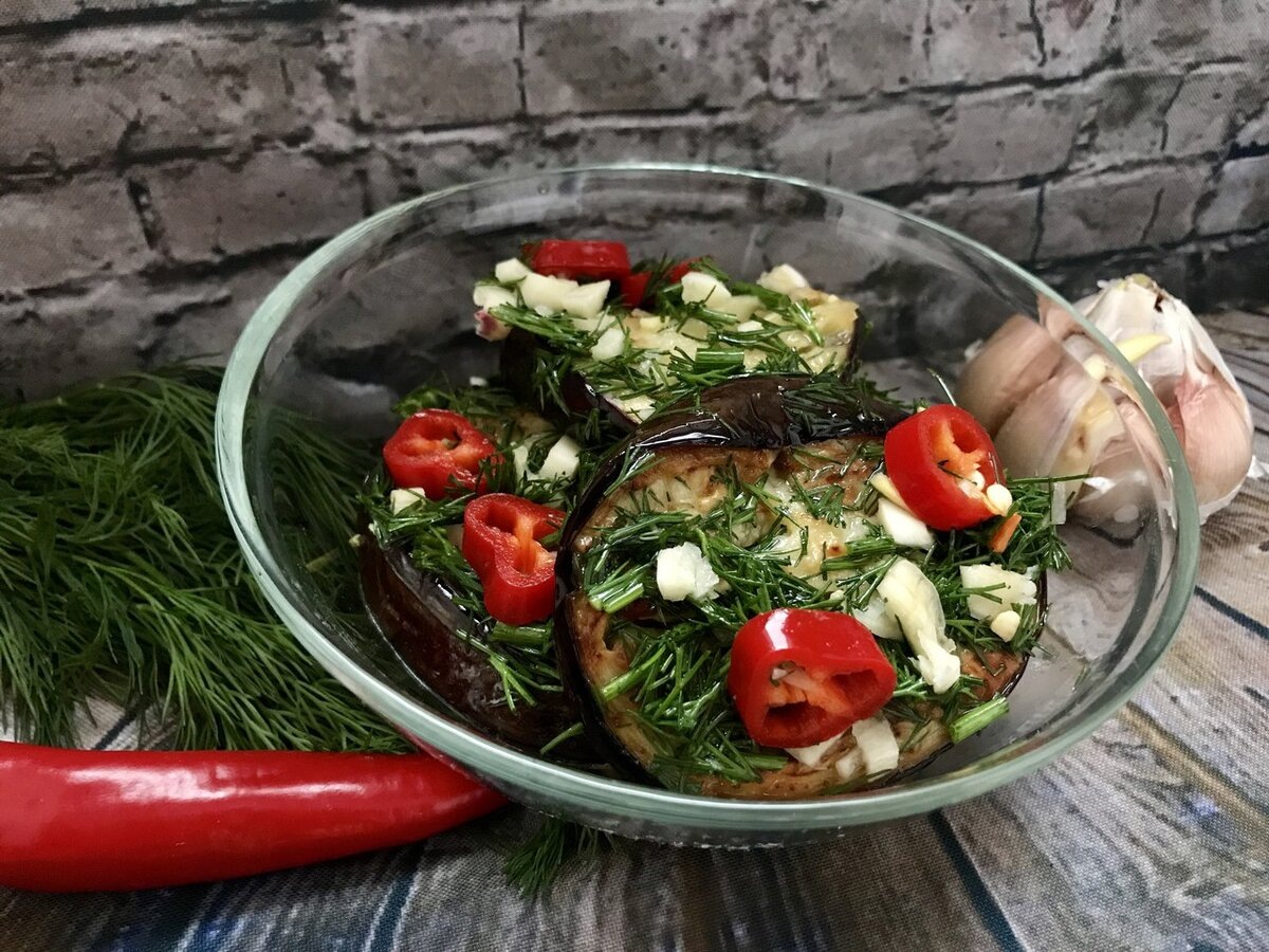 Сахар - 1 ст.л. Баклажаны вымыть и нарезать на кружки толщиной 1,5 см. Выложить слоями на тарелку, каждый из них обильно присыпав солью, чтобы баклажаны пустили сок, - это поможет избавиться от горечи. Оставить на 20-30 минут. Чеснок очистить и мелко нарезать или пропустить через пресс. Укроп мелко нарезать. Перец чили нарезать колечками вместе с семенами. Если хочется сбавить остроту - уберите часть семян. Бумажным полотенцем снять с баклажанов выделившийся сок и соль. Обжарить кружки баклажанов на растительном