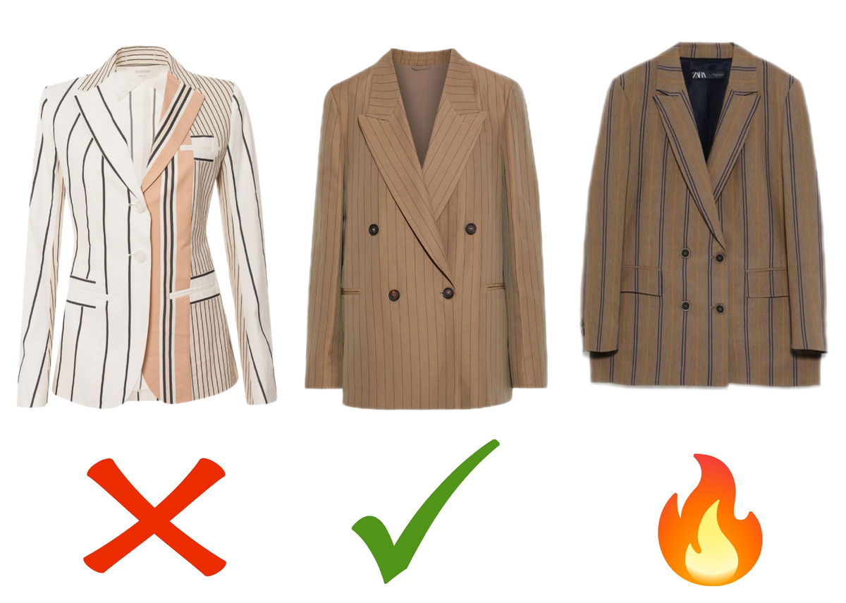 Рассмотрим пять универсальных вариантов, которые подойдут практически ко всему и подчеркнут вашу индивидуальность. Особое внимание уделим деталям, позволяющим легко различить классический стиль от устаревших и современных ультратрендовых решений. ❌Устарело: Комбинация различных видов полосок вместе с устаревшими силуэтами создаёт впечатление хаоса и безвкусицы. Такие решения делают образ визуально перегруженным и дешёвым, придавая ему налет старины. ✅База: Классический жакет обладает прямым кроем, спокойными оттенками и тонкой неконтрастной полоской. Такая одежда является фундаментом любого гардероба, легко комбинируется с разными вещами и подходит как для повседневной носки, так и для делового образа. 🔥Тренд: Настоящий хитом сезона стали яркие и контрастные полосы. Особенно актуально выглядит вертикальная полоска в виде штрих-кода, придающая образу футуристичность и динамичность. Такой акцент сделает ваш наряд актуальным и современным, притягивая взгляды окружающих своей необычностью