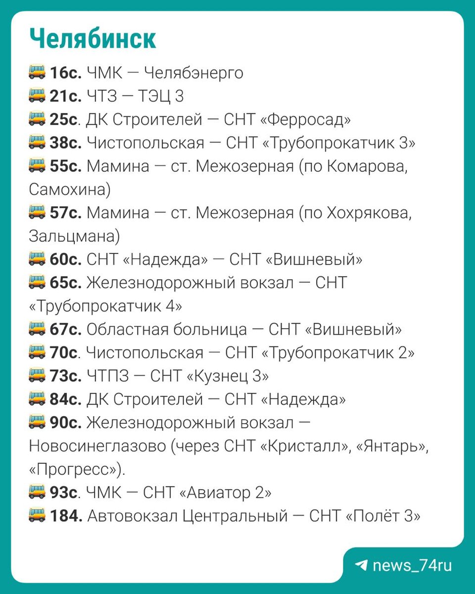Дачный сезон объявляется открытым 🙂 С 26 апреля по 28 сентября будут работать 19 садовых маршрутов: 14 внутри Челябинска, 4 внутри Копейска и один из Челябинска в Сосновский район. Все автобусы работают по регулируемому тарифу и со всеми льготами на городских маршрутах (двухзначные номера). Подробности — в карточках ⬆️