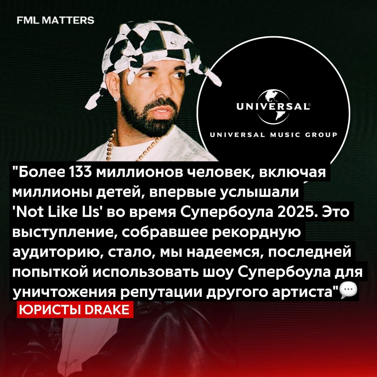 ☄️ ЮРИСТЫ DRAKE ПОДАЛИ КРУПНЫЙ ИСК ПРОТИВ UMG! Юристы Дрейка считают, что выступление Кендрика Ламара на Супербоуле 2025 года было специально «задумано для уничтожения репутации другого артиста» — об этом говорится в дополненной жалобе на 107 страницах. По их словам, выступление посмотрели более 133 миллионов человек, включая огромное количество детей, многие из которых впервые услышали треки, исполненные на шоу, в том числе дисс-трек «Not Like Us», который, был направлен против Дрейка. Они надеются, что подобного в будущем больше не повторится. 💀 FML MATTERS