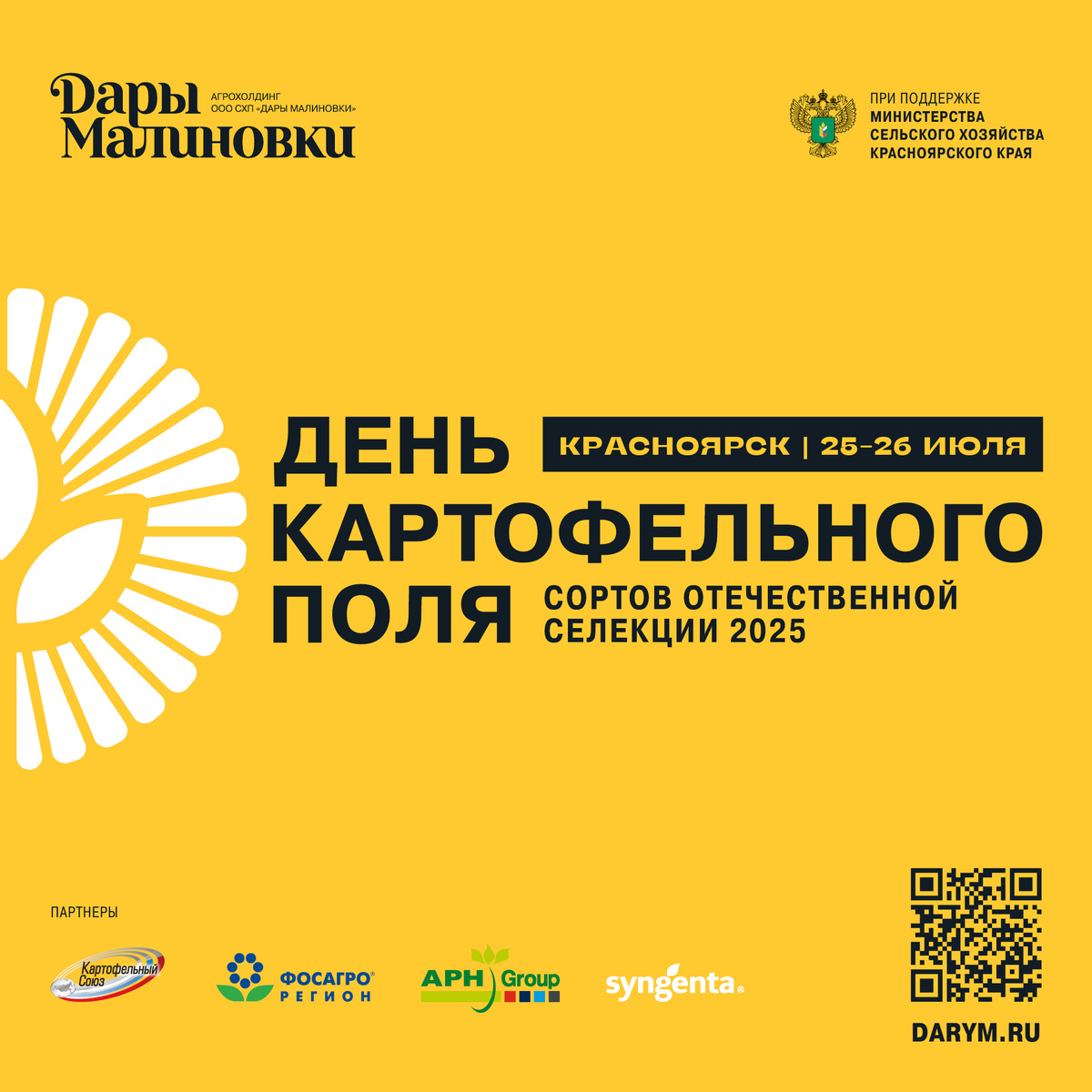 25-26 июля 2025 года на производственной площадке агрохолдинга «Дары Малиновки» пройдет ДЕНЬ КАРТОФЕЛЬНОГО ПОЛЯ сортов отечественной селекции при поддержке Министерства сельского хозяйства Красноярского края. На одной площадке для открытого диалога встретятся участники полного производственного цикла: ✔️российская селекция, ✔️производство семенного материала сортов отечественной селекции, ✔️производство продовольственного картофеля, ✔️технологии выращивания, ✔️система точного земледелия, ✔️автоматизация и роботизация, ✔️техника для производства картофеля, ✔️технологии хранения картофеля, ✔️мелиорация, ✔️методы борьбы с заболеваниями растений, ✔️переработка картофеля, ✔️продажа сортового картофеля в торговые сети и HoReCa, ✔️государство, ✔️финансы, ✔️образование, ✔️профильные сообщества. ДЕНЬ КАРТОФЕЛЬНОГО ПОЛЯ сортов отечественной селекции пройдет на 2х площадках в д. Татарская Красноярского края: 🌱демонстрационное поле с лучшими сортами картофеля отечественной селекции, 🧰павильон д