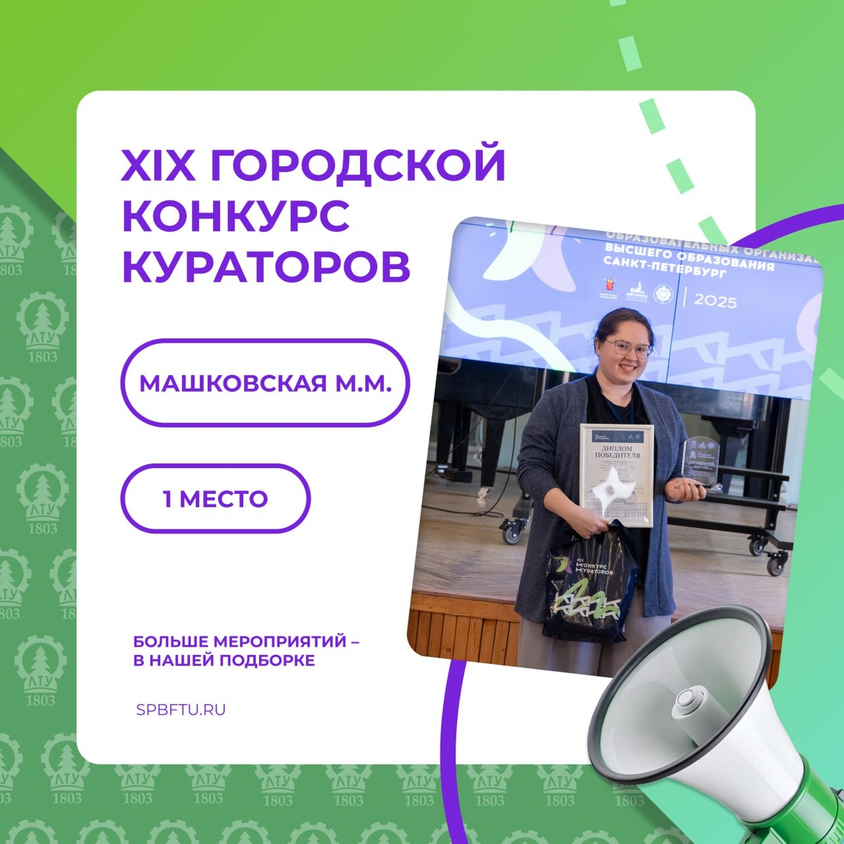 Студентка СПбГЛТУ победила в конкурсе кураторов 🏆 👨🎓 Завершился XIX Городской конкурс кураторов, ежегодно объединяющий самых отзывчивых и заботливых наставников студенческих сообществ. В этом году участие приняли более 60 кураторов, среди которых была студентка СПбГЛТУ Марья Машковская. 🥇 В номинации «Лучший куратор-студент студенческого сообщества» Марья Машковская заняла первое место. 📈 Институт наставничества и кураторства в Санкт-Петербурге активно развивается, и с каждым годом работы становятся всё более содержательными и профессиональными. Поздравляем Марию Машковскую с победой и желаем дальнейших успехов 🎉