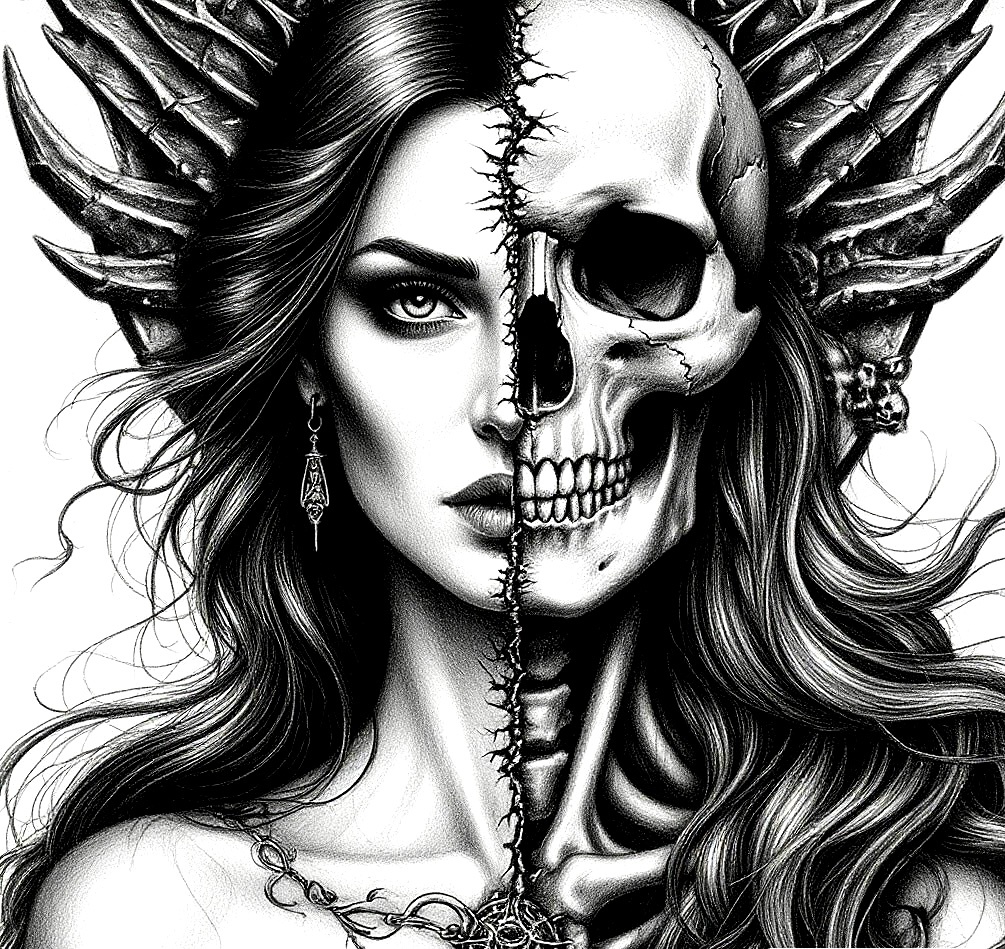 Сейчас во время призывов все чаще Хель показывается мне, как черный силуэт в чёрном плаще с широкими рукавами и надетым капюшоном, из-за которого не видно лица. Иногда она приходит с косой, бывает, что показывается только в виде черепа, а, под настроение, может явиться и в своем классическом образе, как ее описывают в скандинавской мифологии: одна половина лица - облик красивой и живой девушки, а вторая - лик смерти в виде черепа и костей.