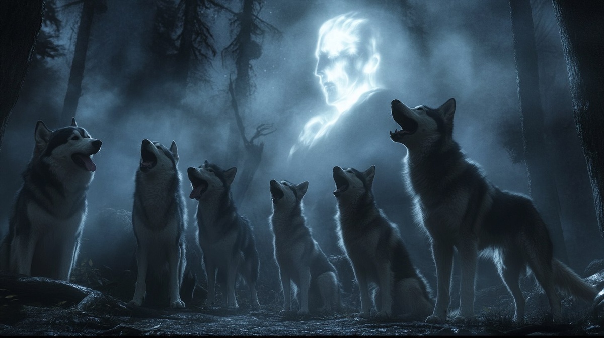 Создано на основе запроса: A hyper-realistic scene of several dogs howling together in a dark, foggy forest at night. The dogs including huskies, German shepherds, and mixed breeds are standing alert with fur raised, eyes glowing from the moonlight, and mouths open mid-howl. They are all looking in the same direction with intense focus. In the background, a faint, ghostly human-like silhouette made of swirling mist and smoke floats eerily above the ground. The forest is dense with twisted trees and drifting fog, with soft moonlight piercing through the canopy and casting natural shadows. The scene is cinematic, atmospheric, and highly detailed, with no text or writing in the image. --- Автоперевод: Гиперреалистичная сцена нескольких собак, воющих вместе в темном туманном лесу ночью. Круто вышло? 🤔 https://dzen.ru/id/65c0c65c86e4f837c27b24d7 #ИИ #AI #нейросеть #midjourney #art