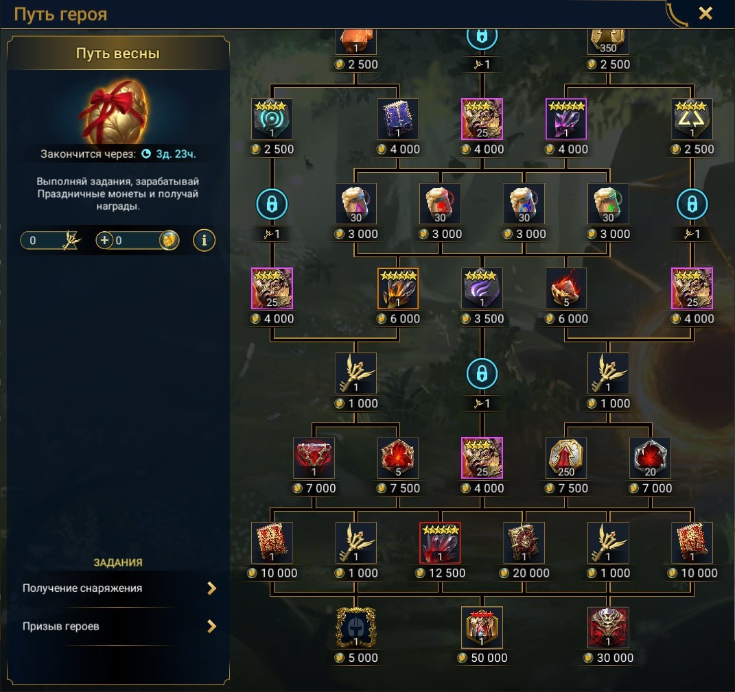Стартовало событие "Путь Весны". Среди наград 100 частиц Юзана Затерянного(эпик со слияния),Единая душа 5* Лиснтира, тематическая оправа для аватара, тома навыков и другие ресурсы. Очки начисляются за: - Получения снаряжения - Призыв героев