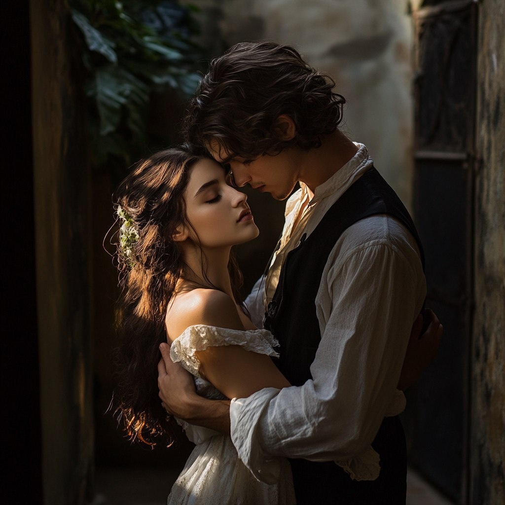 Создано на основе запроса: Romeo and Juliet photoshoot, hyper realistic, embrace, mood lighting, dynamic