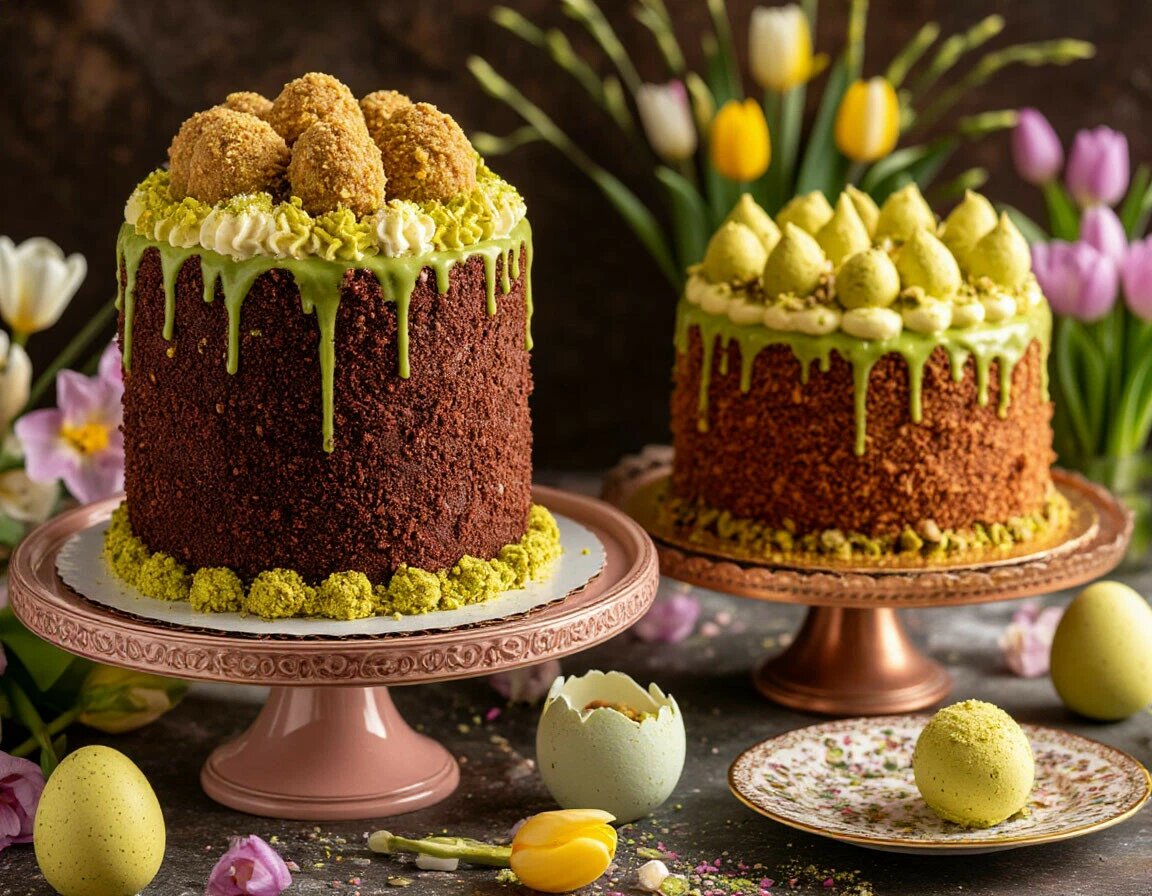 - Глазурь и украшение: растопите белый шоколад, добавьте фисташковую пасту и при желании краситель. Глазурь нанесите на верхушки куличей. Посыпьте рублеными фисташками. Можно проявить фантазию и использовать другие украшения, которые есть под рукой.
