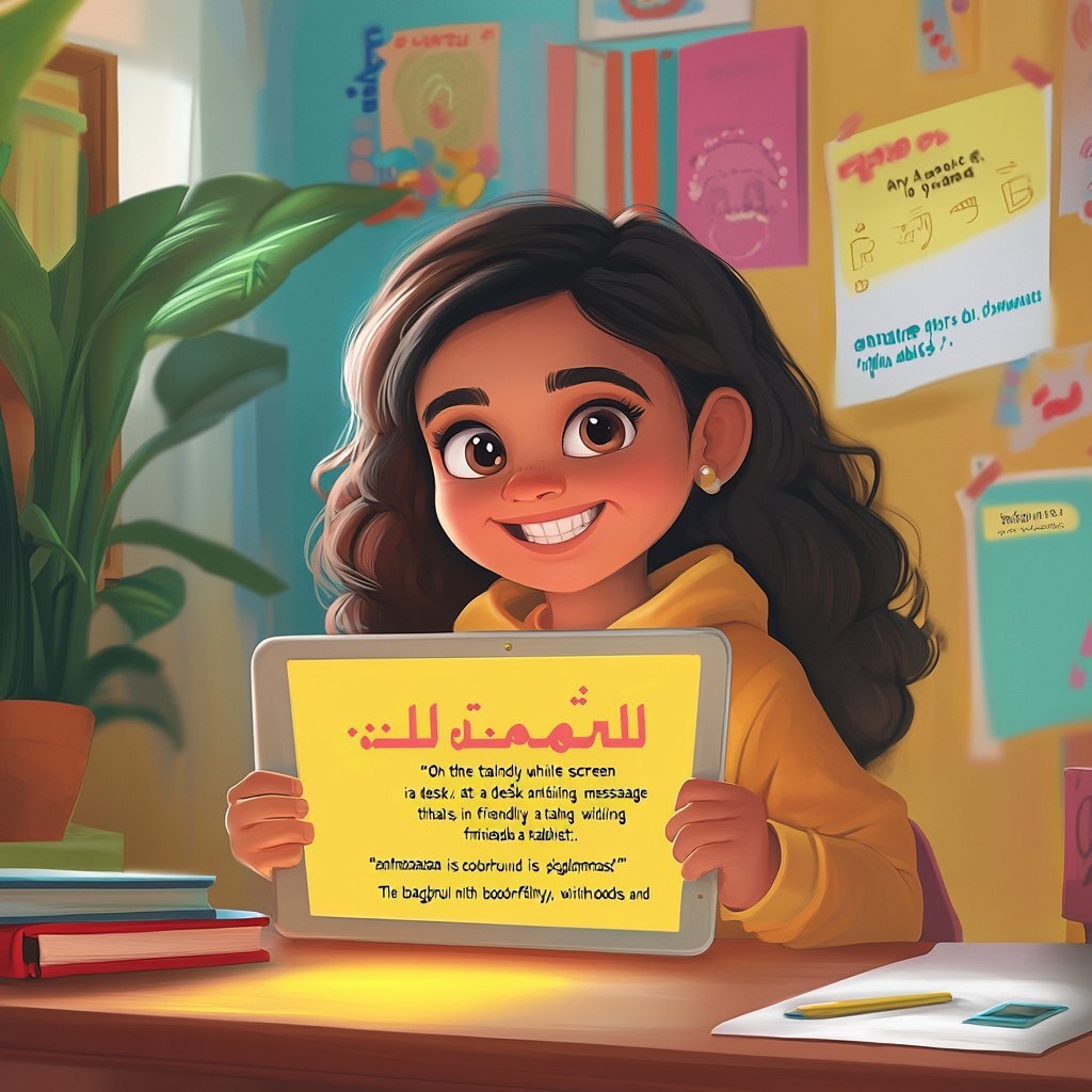 Создано на основе запроса: "An Arabic girl around 10 years old, sitting at a desk and smiling while holding a tablet. On the tablet screen is a friendly message that says in Arabic: 'أحببت رسوماتك!'. The background is colorful and child-friendly, with books, a plant, and posters. Style: digital illustration, cartoon-like, warm lighting, educational and safe internet atmosphere." --- Автоперевод: «Арабская девушка около 10 лет, сидящая за столом и улыбаясь, держа планшет. На таблетном экране-это дружеское послание, которое говорит на арабском языке:« أحببت رسوماتك! Классно выглядит? 🤔 https://dzen.ru/id/65c0c65c86e4f837c27b24d7 #ИИ #AI #нейросеть #midjourney #art