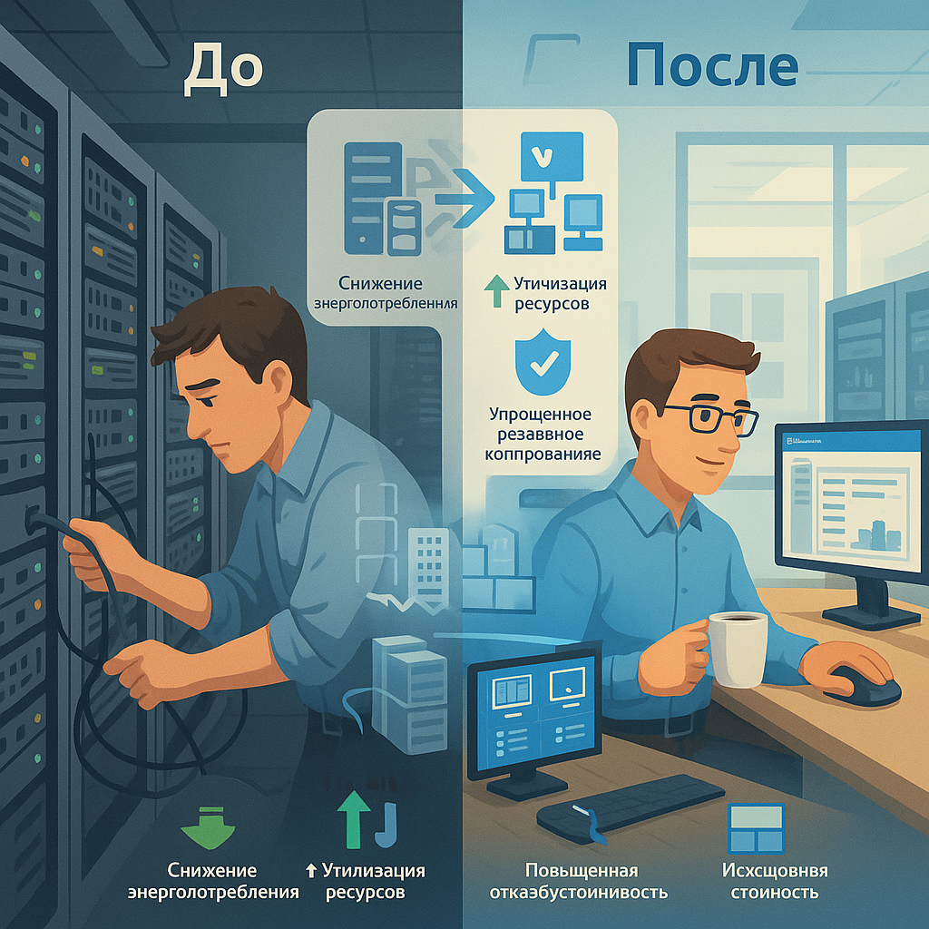 Обновление физических серверов часто требовало плановых простоев. Установка патчей, обновление прошивок, замена компонентов — всё это означало недоступность сервисов для пользователей.