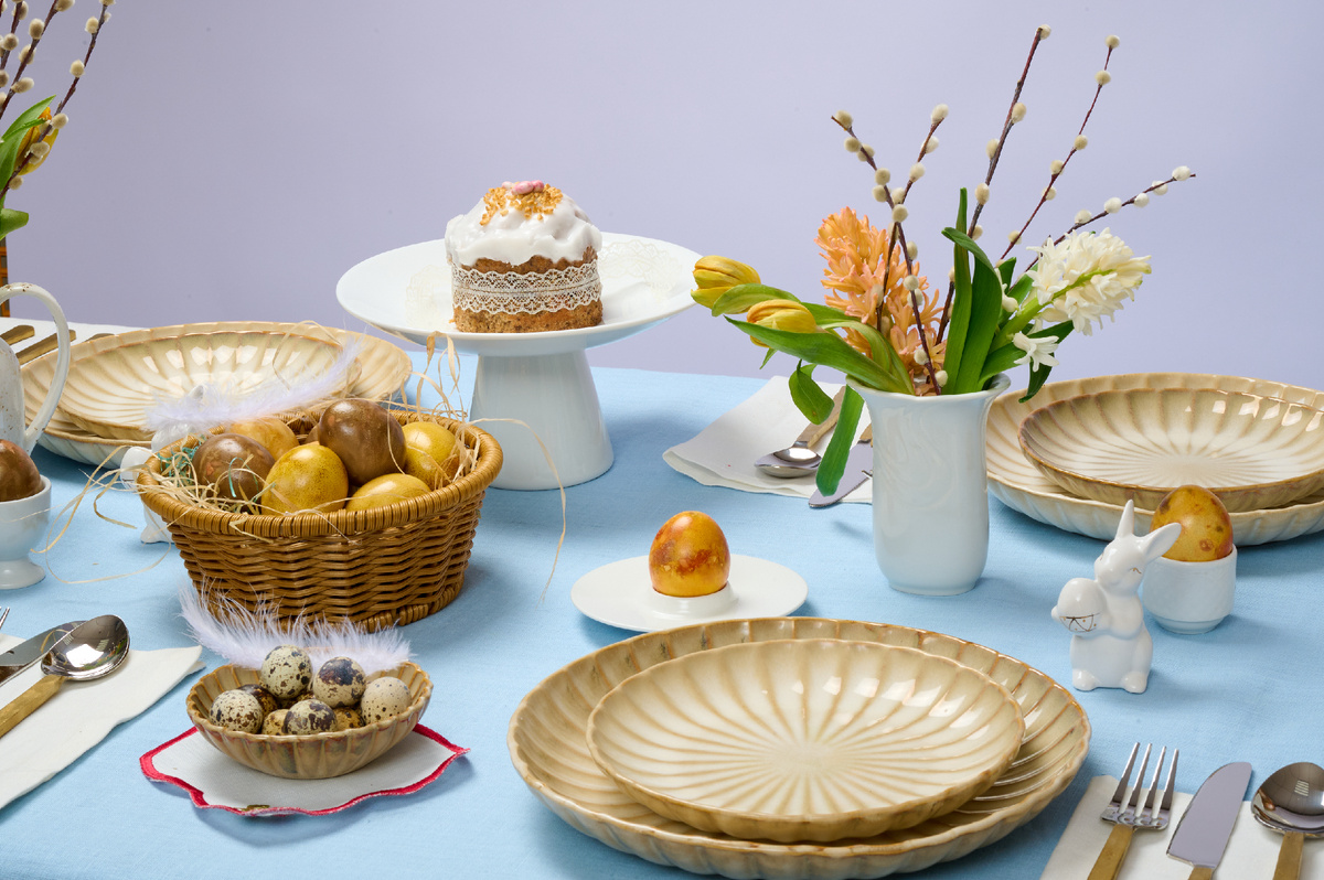 Среди ароматов весенних цветов и света нового дня, сервировка стола на Пасху становится не просто ритуалом, а отражением семейных традиций и эстетики. Вдохновением для этой композиции послужила идея утреннего пасхального завтрака — неспешного, домашнего, но при этом визуально совершенного. В центре внимания — пасхальная сервировка, построенная на сочетании природных фактур, нежной керамики и приглушённых тонов. Основу композиции составляют пасхальные тарелки из коллекции Cosy&Trendy "Астера": рельефная форма и теплый бежево-песочный цвет делают их идеальными для сервировки бежевого стола. Их глубина и форма раскрывшегося цветка уместны как для подачи кулича, так и для других традиционных пасхальных блюд. Центральная часть стола оформлена как современная интерпретация пасхального декора. Цветочная композиция в кувшине из коллекции Steelite "Крафт Вайт" объединяют вербу, тюльпаны и гиацинты — символы пробуждения природы. Это решение органично вписывается в весеннюю сервировку стола, прид